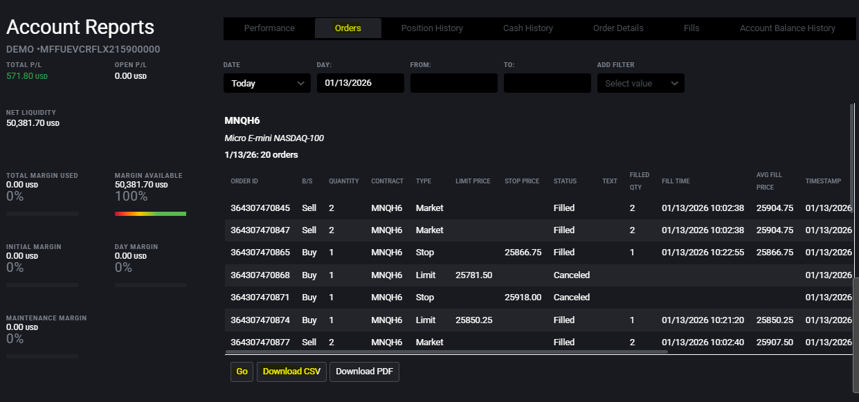 orderId,Account,B/S,Contract,Product,avgPrice,filledQty,Fill Time,Status 284301090007,DEMO123, Buy,MNQU5,MNQ,24018.25,2,09/12/2025 09:42:07, Filled 284301090042,DEMO123, Sell,MNQU5,MNQ,24067.0,2,09/12/2025 10:27:05, Filled